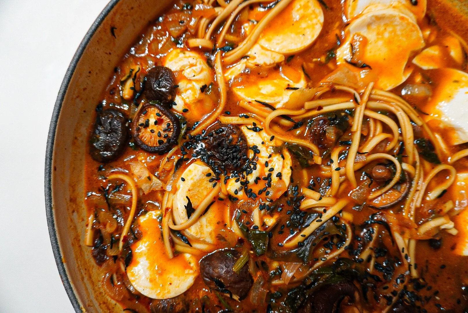 Slice the onions. In a large deep pan or skillet, heat the olive oil on a medium heat. Add the onion, sprinkle some salt, and cook till translucent. Add a teaspoon of white miso and 2 teaspoons of gochujang paste and stir. Add some water and deglaze the pan.