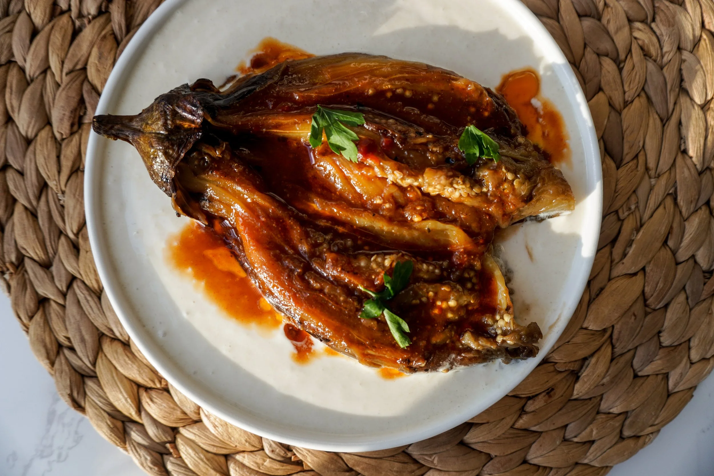 Spread the white sauce on a plate. Top it with the aubergine, and then with the chilli oil.